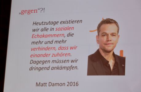In verschiedenen Vorträgen und Workshops wurde das Thema facettenreich und auch interaktiv analysiert und begreifbar gemacht. Es wurden Wege aufgezeigt, einerseits eigene Positionen zu schärfen und zu verdeutlichen, andererseits aber auch diskursfähig zu bleiben und andere – auch extreme – Positionen des politischen Streits um der Demokratie Willen bewusst zu integrieren. Dabei wurde auch immer wieder die eigene Selbstverständlichkeit der ‚richtigen Meinung‘ bei den Teilnehmenden selbst reflektiert und hinterfragt.